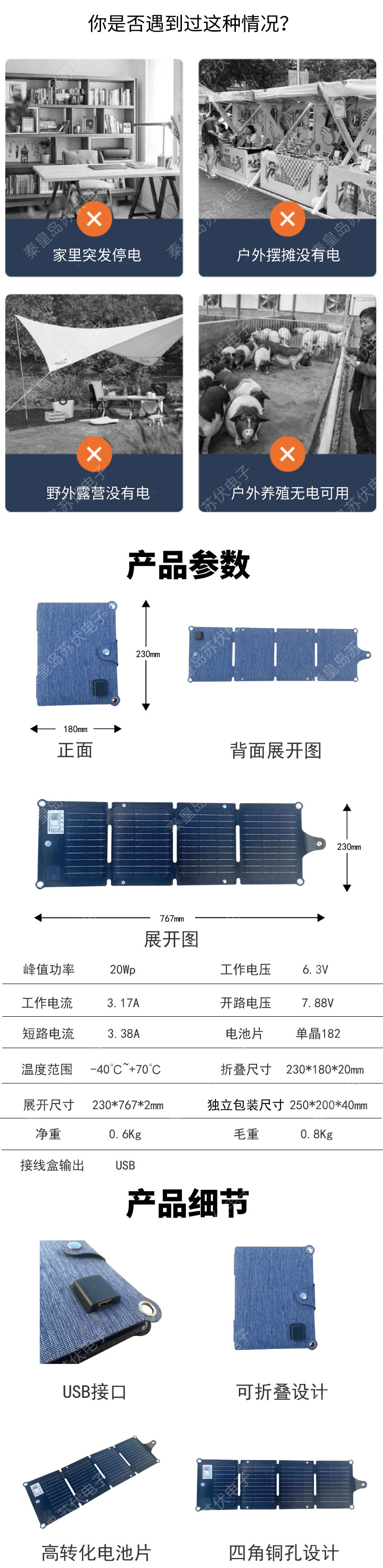 秦皇島新品20W便攜式太陽能折疊包可移動(dòng)電源四折光伏充電板工廠