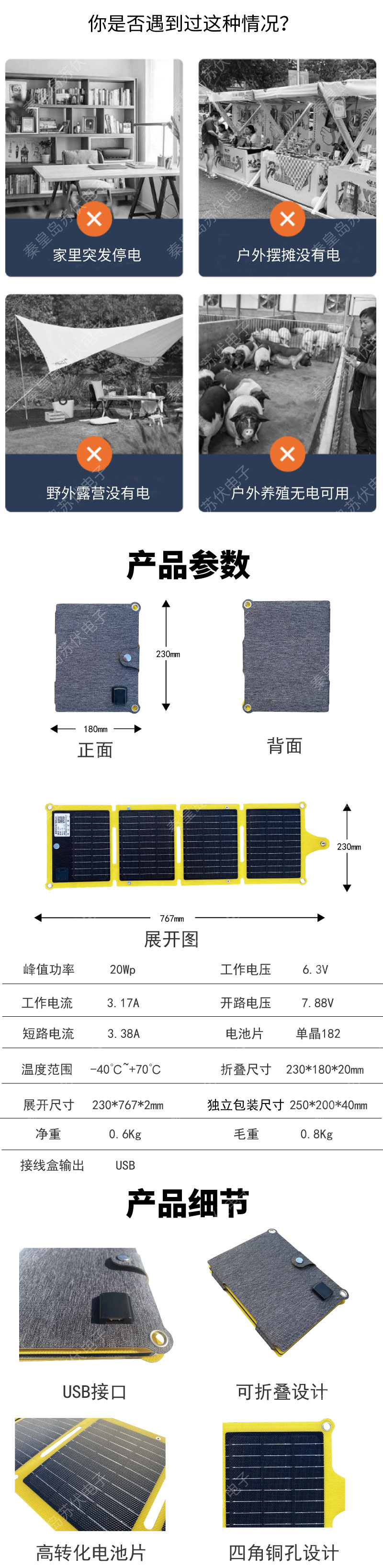 單晶20W太陽能板折疊充電包戶外手機(jī)充電光伏板便攜太陽能充電器